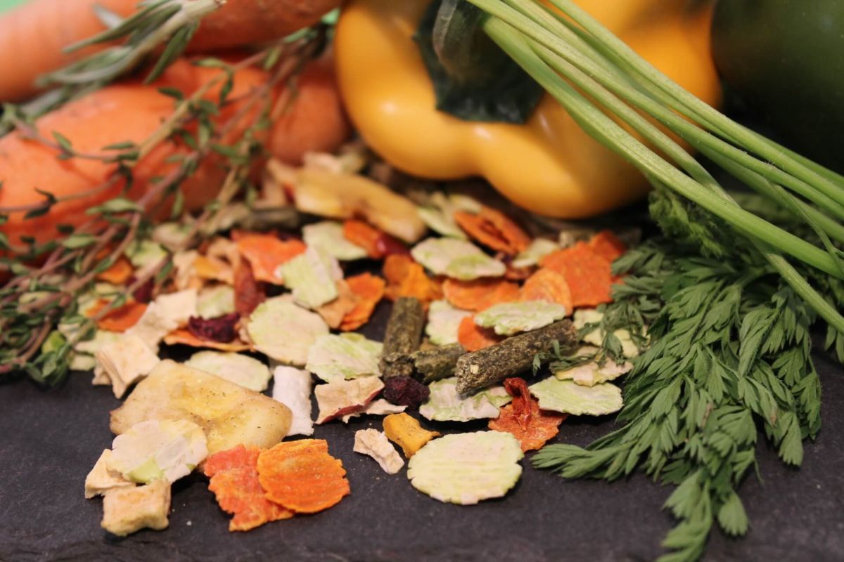 Erbsenflocken, Karotten getrocknet, Luzerne getrocknet, Pastinaken getrocknet, Bananen getrocknet, Apfel getrocknet, Rote Beete getrocknet, Paprika getrocknet, Kürbis getrocknet, Zucchini getrocknet, Pflanzliche Mischung mit Kräutern getrocknet (Brennnesselkraut, Karotten, Leinsaat, Selleriestängel, Fenchel bitter, Kümmel, Schafgarbe, Brombeerblätter, Kamille, Mistelkraut, Enzianwurzel, Tausendgüldenkraut, Kalmuswurzel)